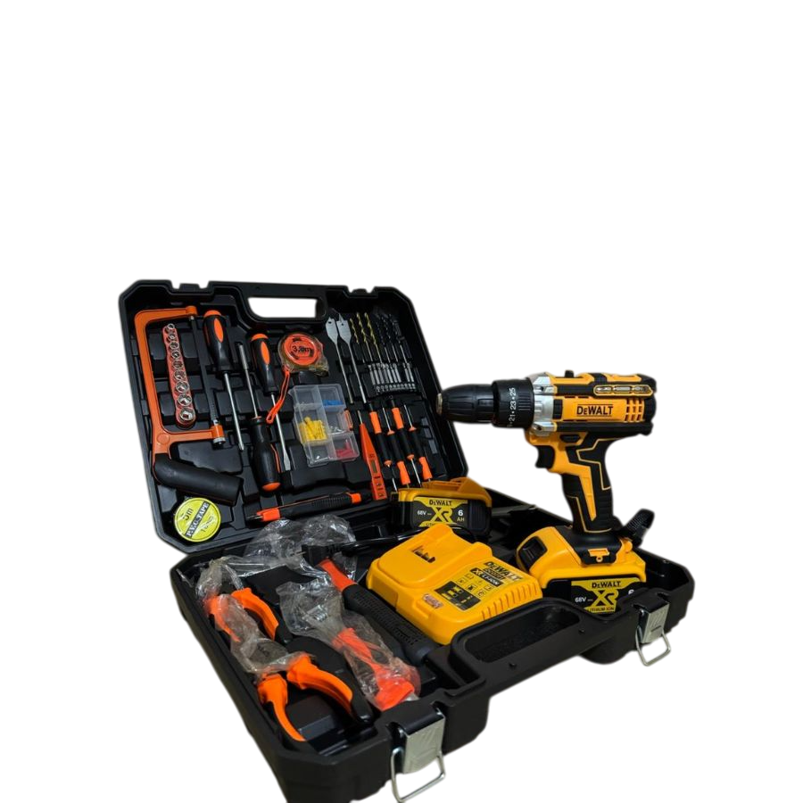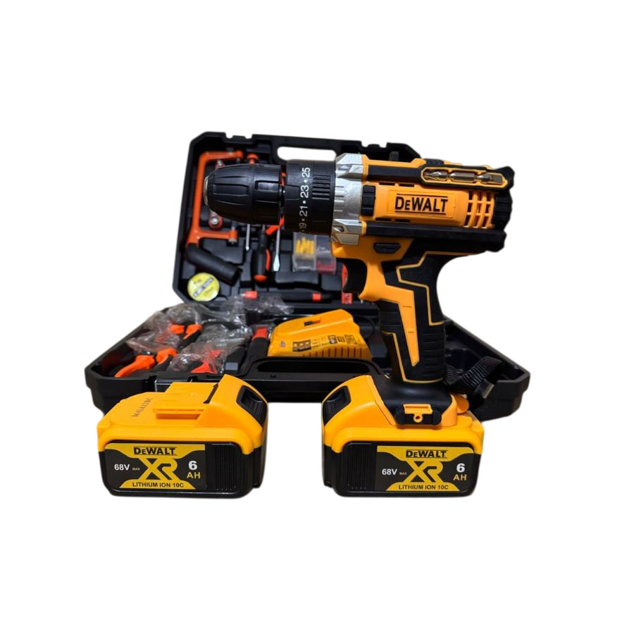 Recibirás una taladradora atornilladora DEWALT 68V, dos baterías de litio, un cargador de carga rápida y un maletín con múltiples accesorios: brocas, puntas, alicates, cinta métrica, entre otros. ¡Todo listo para comenzar a trabajar!